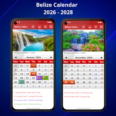 Belize Calendar 2026 je váš osobný kalendár s prehľadom štátnych sviatkov pre Belize (2024-2028). Pridávajte udalosti, poznámky, označujte dôležité dátumy ako výročia či narodeniny a nastavujte opakované pripomienky. Kalendár si môžete prispôsobiť vlastnými obrázkami, ikonami a farbami. Ľahko spravujte svoj čas a nezabudnite na nič dôležité.