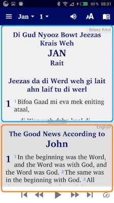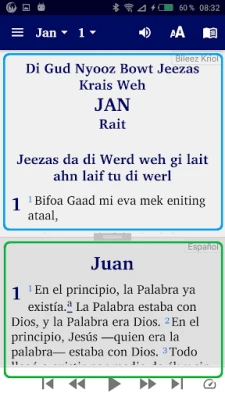Ponorte sa do hlbín duchovného textu s revolučnou aplikáciou, ktorá vám prináša Nový zákon v jazyku Bileez Kriol. Táto intuitívna platforma je navrhnutá pre maximálne pohodlie a prispôsobenie vášho čítania. Vyberte si z troch unikátnych režimov zobrazenia: pre puristov je tu možnosť „jednej tabule", kde sa plne sústredíte len na text v jazyku Bileez Kriol. Pre tých, ktorí preferujú porovnávacie štúdium, ponúkame režim „dvoch tabúľ", ktorý prehľadne zobrazí Bileez Kriol hore a paralelne s ním anglickú, španielsku alebo nemeckú verziu dole. A ak dávate prednosť detailnému veršu za veršom, náš špeciálny režim vám umožní vidieť jeden verš v Bileez Kriol, ihneď nasledovaný jeho ekvivalentom v jednom z troch cudzích jazykov.